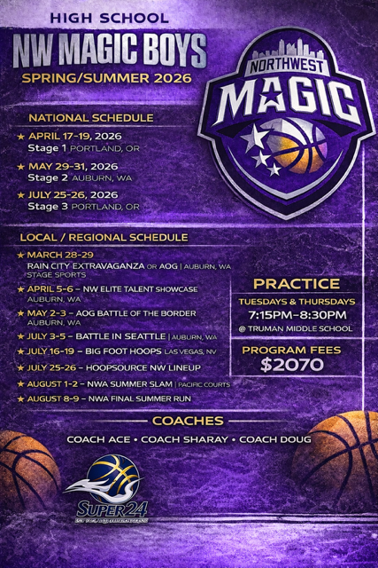 NW Magic Boys competes on the Super 24 Circuit, one of the premier independent high school basketball platforms in the country. Super 24 provides elite competition, high visibility, and exposure to college coaches across all levels.